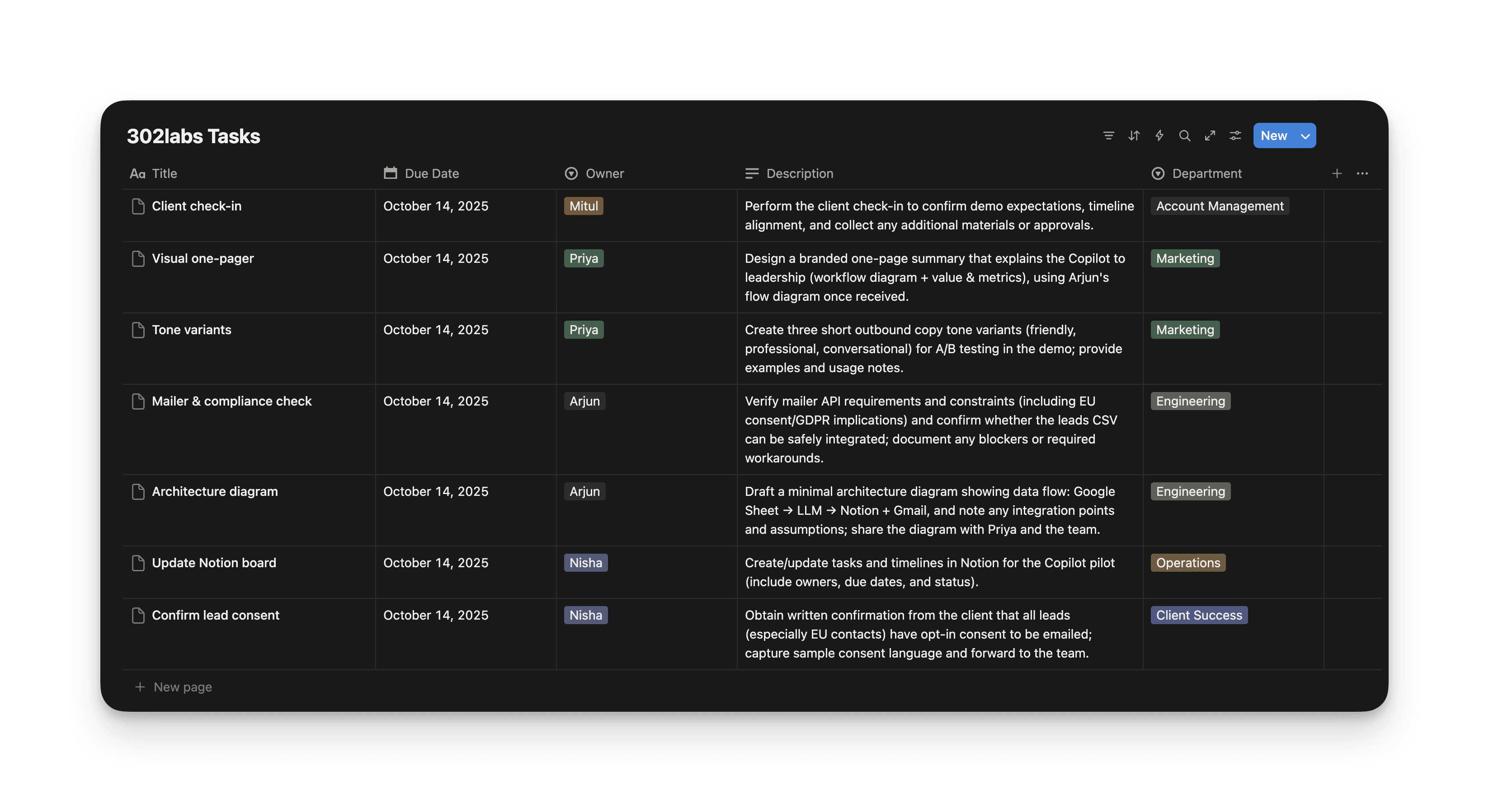 Built internally to automate meeting summaries and convert conversations into structured, owned tasks.